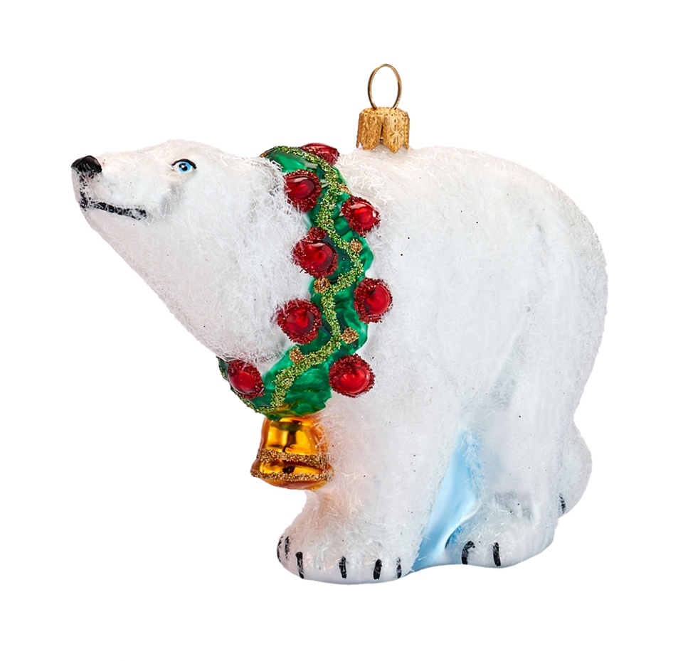 Игрушка для ёлки «Белый медведь с венком на шее блестящий» стеклянная, Impuls, 13 см, Польша