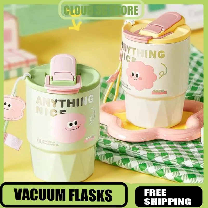 Изолированная кофейная кружка Relea, термос с керамическим покрытием, мультяшная чашка для воды с соломинкой, портативная чашка для чая с молоком и ремешком, подарок для девочки