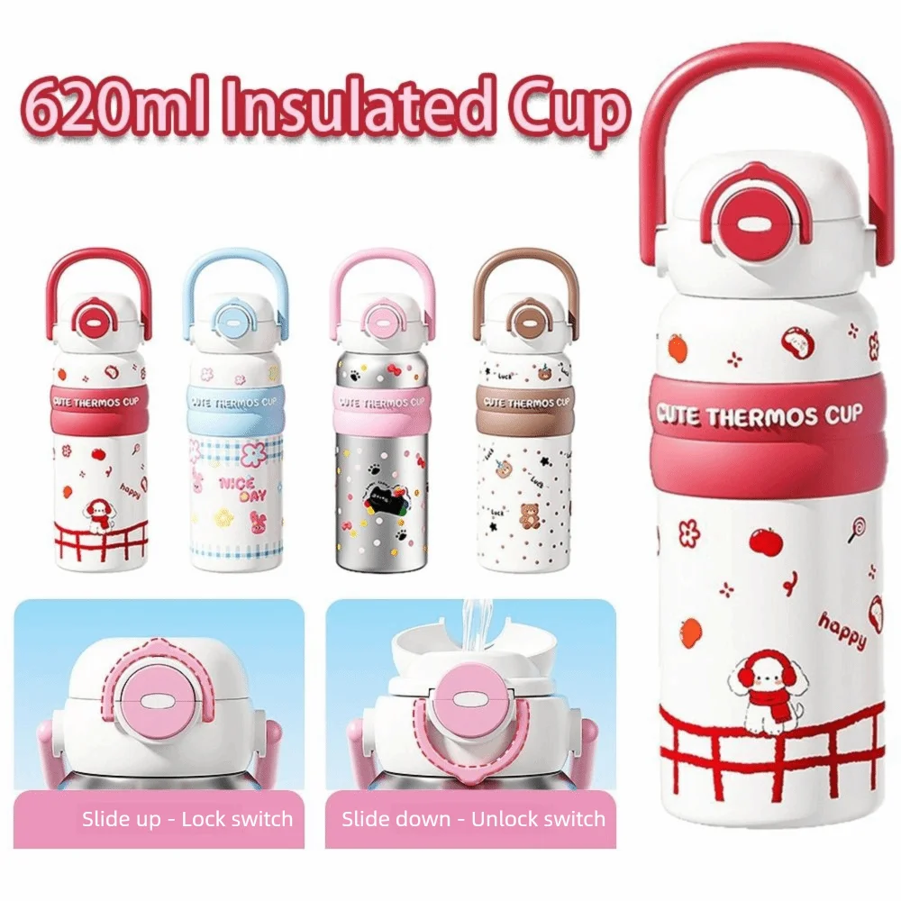 Изолированная чашка 620 мл, двойная чашка для напитков, большая емкость, мультяшные соломенные чашки с ручкой, аксессуары для бутылок с водой с тепловой и холодной изоляцией
