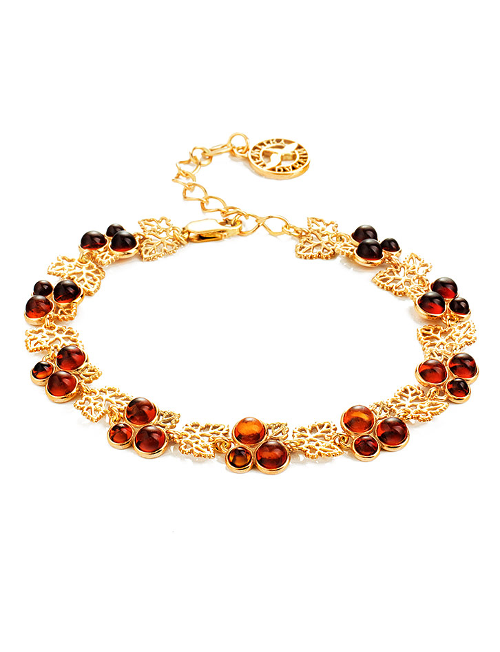 Изысканный позолоченный браслет «Виноград» с натуральным коньячным янтарём, Коньячный