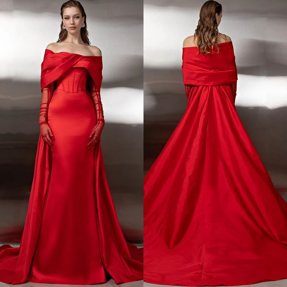Изящное атласное вечернее платье с вырезом лодочкой по индивидуальному заказу. Изысканные платья для выпускного вечера с русалкой. Нежные платья со шлейфом для особых случаев.