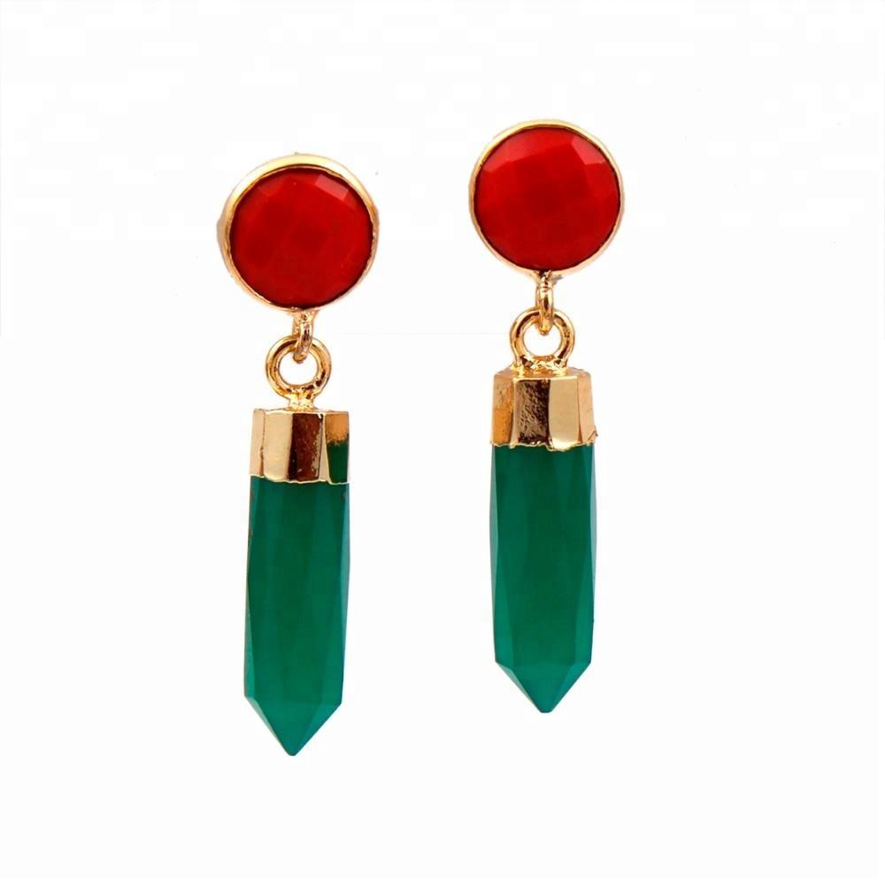 Изящные женские серьги с двойными драгоценными камнями из красного коралла и зеленого оникса, замечательные ювелирные изделия с позолоченной цангой, комплект с подвесками и подвесками