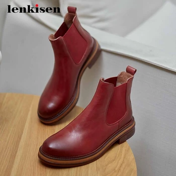 Lenkisen new arrival short boots real leather stretch dating thick med heel round toe slip on young girls dress ankle boots L81
