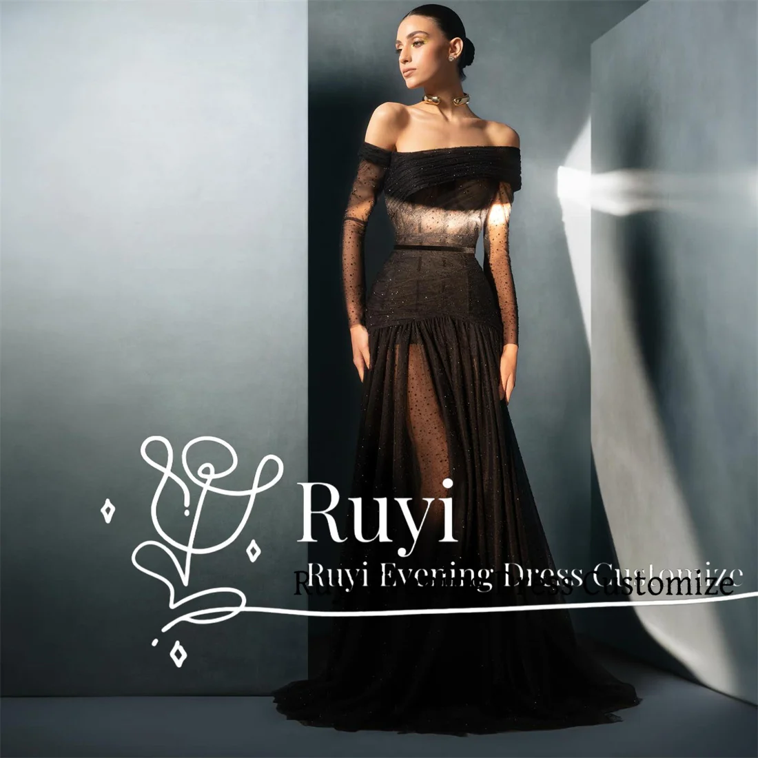 Индивидуальные блестящие тюлевые черные элегантные сексуальные вечерние платья для особых случаев с рюшами и длинными рукавами, вечернее платье для выпускного вечера