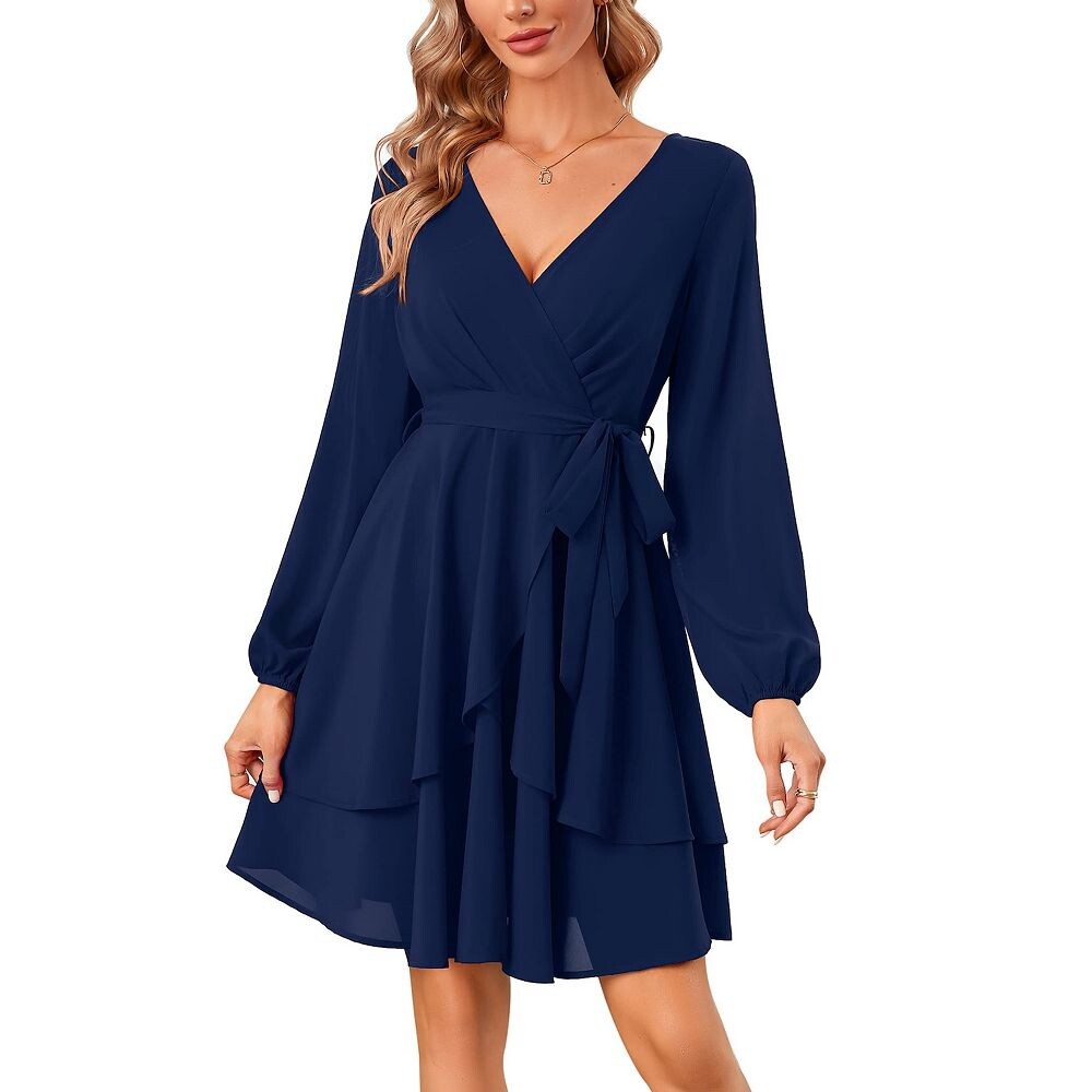 Женские платья-фигуристки, сексуальное мини-платье с v-образным вырезом и короткими рукавами и завязкой на талии, однотонное струящееся мини-платье в стиле бохо с рюшами Kojooin, темно-синий