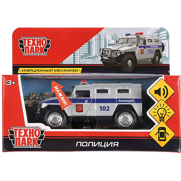 Коллекционная модель бронемашины выполнена в реалистичном дизайне с надписями «Полиция», «102» и тщательно продуманными деталями: защищенным люком в крыше, усиленный бампер типа «кенгурятник», боковыми зеркалами, сигнальным проблесковым маячком, выведенной наверх выхлопной трубой и задним креплением для «запаски». Броневик оснащен надежной колесной базой с рисунком протектора на шинах и инерционным механизмом: если потянуть автомобиль на себя и отпустить, то он сразу же поедет вперед. Если надавить сверху на корпус, то нажмется кнопка внизу и активируются звуковые и световые эффекты. Передние двери открываются и закрываются. Игрушка пригодится в сюжетно-ролевых играх, поможет в проигрывании различных жизненных сценариев, в развитии воображения, координации, ловкости и речи.