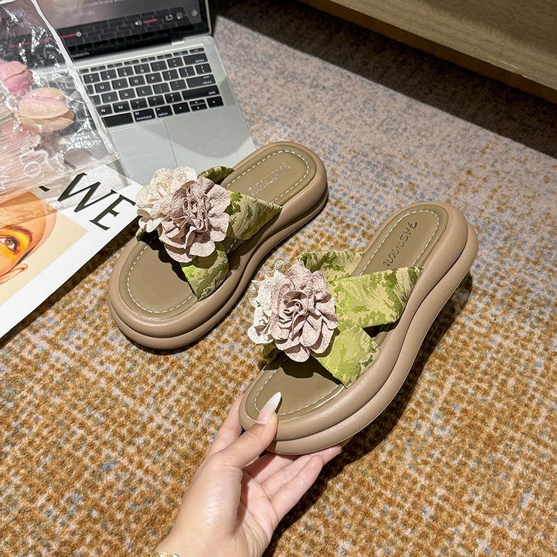 Интернет знаменитости цветок шлепанцы женские, лето новые обрезанные ноги пляжные толстодонные прохладные тапочки, маленькие тапочки 40 зелёный