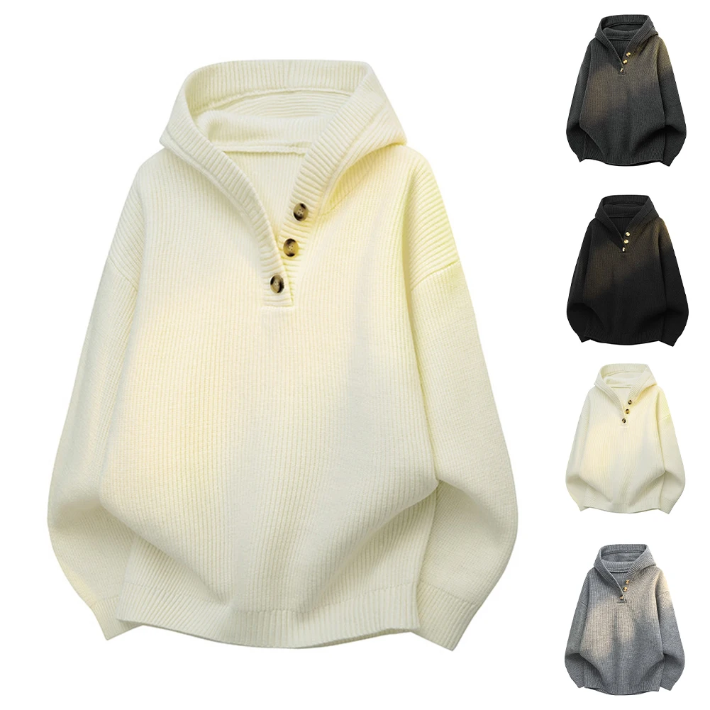 Мужские свитера с капюшоном, вязаные утепленные трикотажные однотонные топы на пуговицах