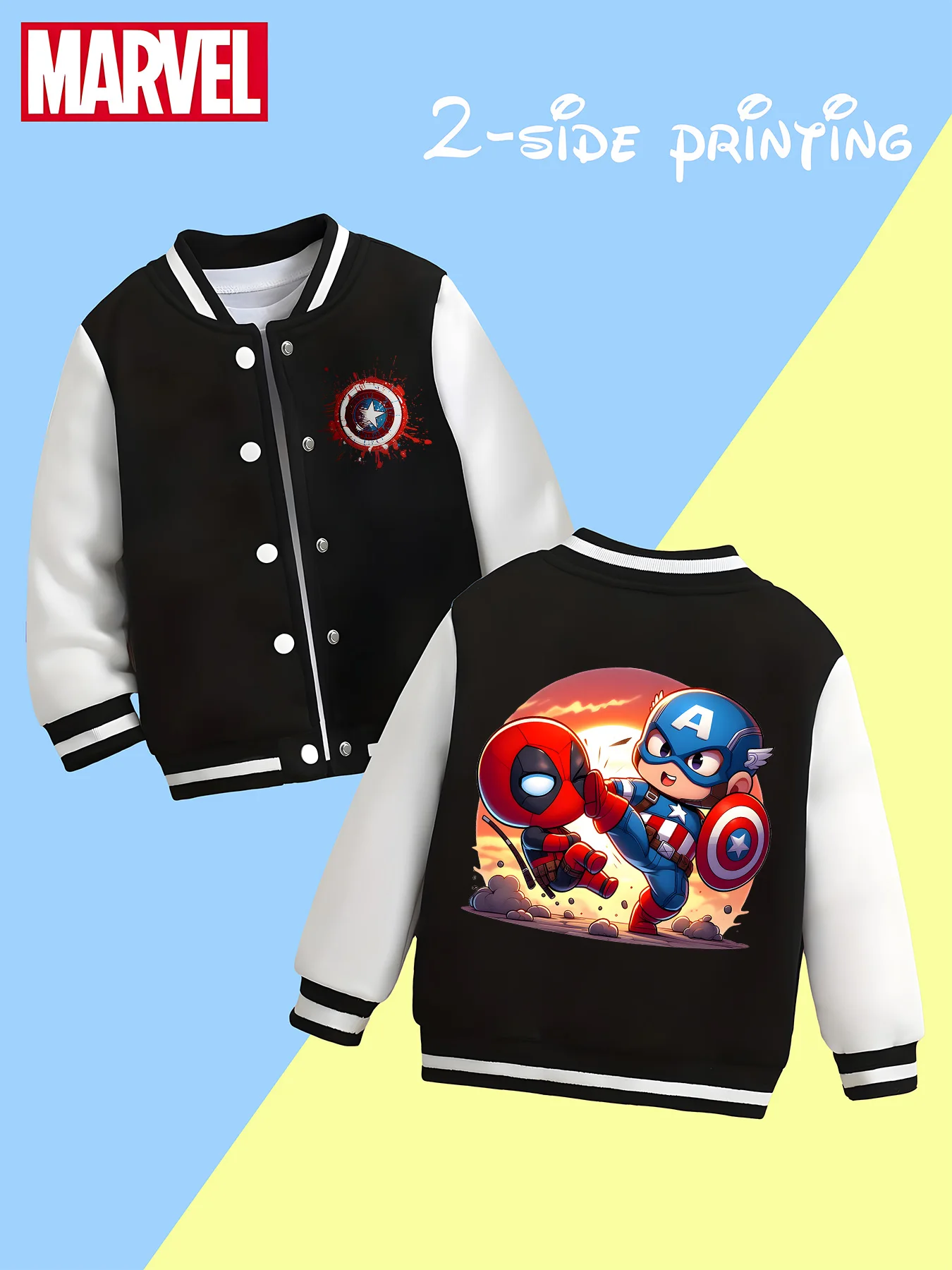 MINISO Marvel Deadpool & Captain America Kids Baseball Jacket - Black and White, Soft Skin-Friendly Fabric, Autumn and Winter Ca