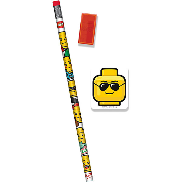 Карандаш украшен логотипом Lego и персонажами конструктора, сверху имеется ластик. К нему идёт точилка и квадратный ластик с принтом.