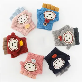 Autumn Winter Boys Girls Gloves Flip Half Finger Gloves Simple Cold Writing Cartoon Print Glove