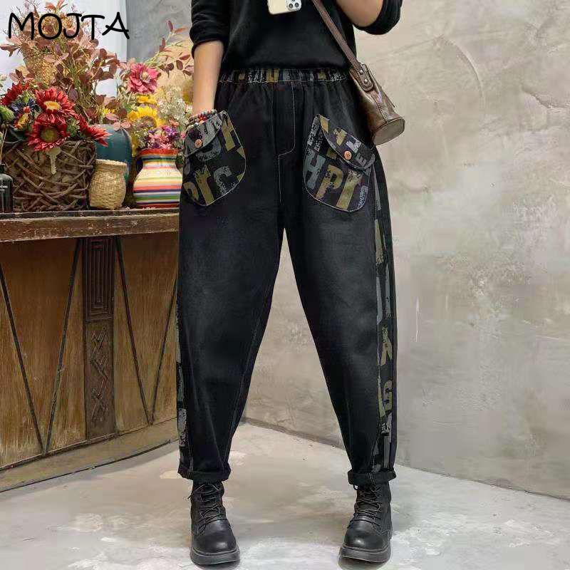 Карманные шаровары женские с высокой талией, свободные женские джинсовые брюки, летние модные джинсы с принтом, женские укороченные брюки