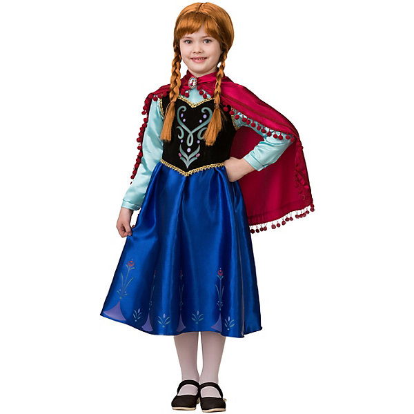 Наверняка все помнят замечательный мультфильм «Дисней» «Холодное сердце». Принцесса Анна – героиня этого мультфильма – жизнерадостная, веселая и улыбчивая девушка. Ее персонаж близок по духу многим, она не отчаивается и не унывает и готова на все ради того, что ей дорого. В комплект входит платье темно-синего цвета, нарядный жилет и темно-красный плащ.