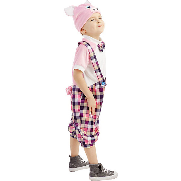 Карнавальный костюм "Поросёнок Ниф-ниф" для мальчиков, выполнен из плюша розового цвета, с имитацией клетчатого комбинезона. Образ дополняет шапка-маска в виде мордочки поросёнка. застежка по спинке на молнии.