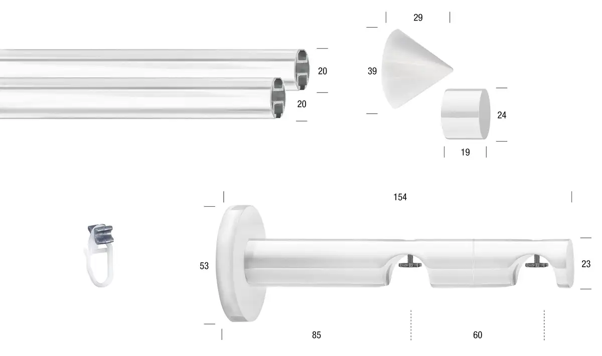 Карниз для штор GARESA "WHITE", 2 направляющие, желаемая длина, комплект для штор, внутренняя направляющая, выдвижная, настенный монтаж, наконечник торцевой кнопки 160 см, Ø 20 мм, белый