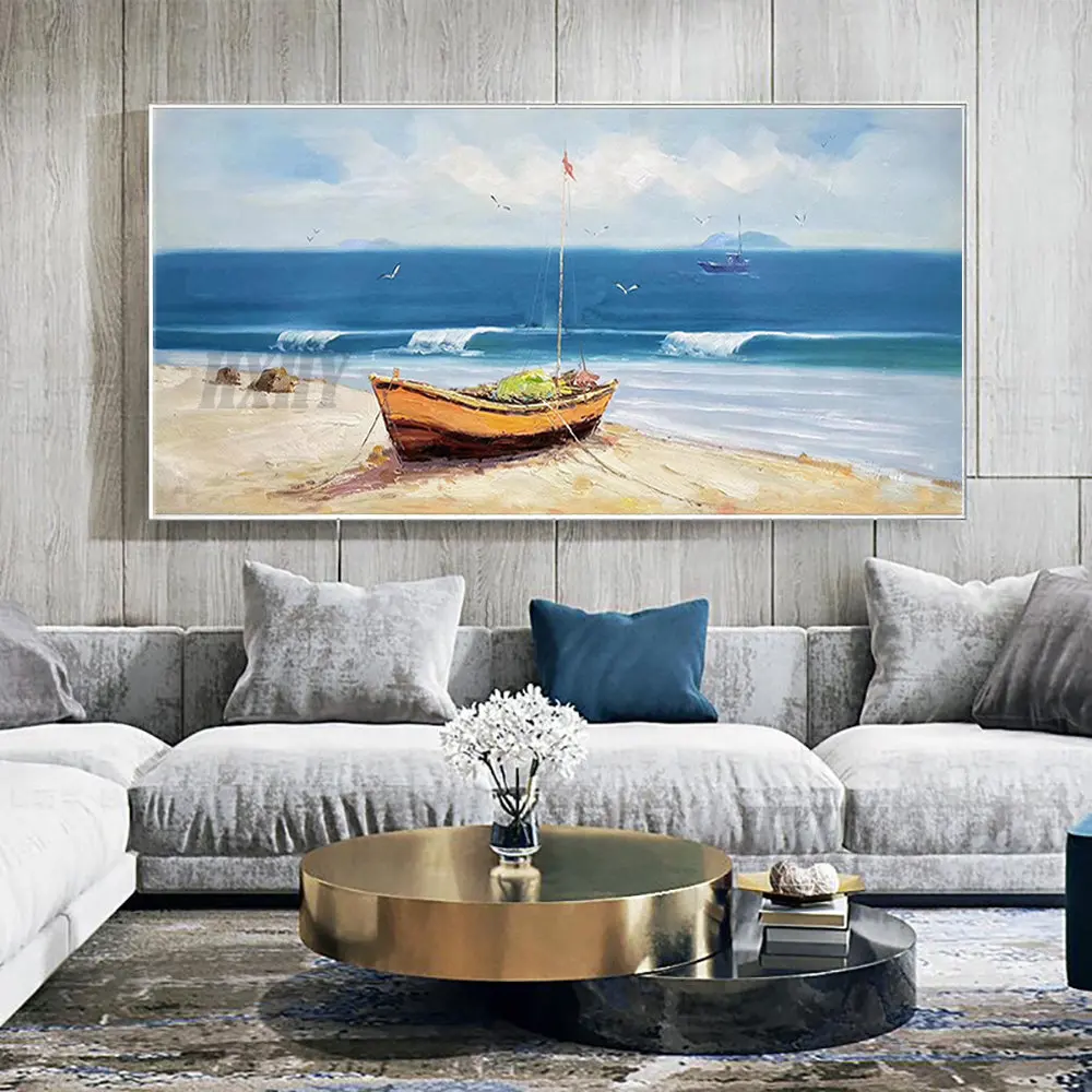Картина маслом на холсте морской песчаный пляж лодка ручная работа пейзаж большого размера Настенная картина ручная роспись картины для ин...