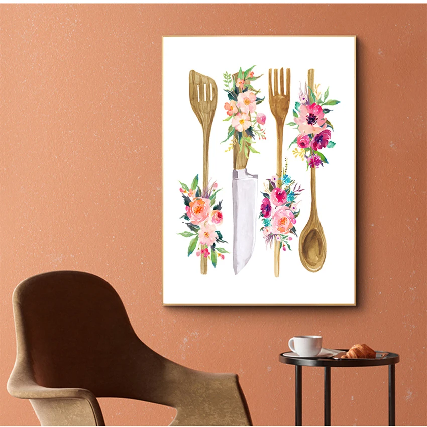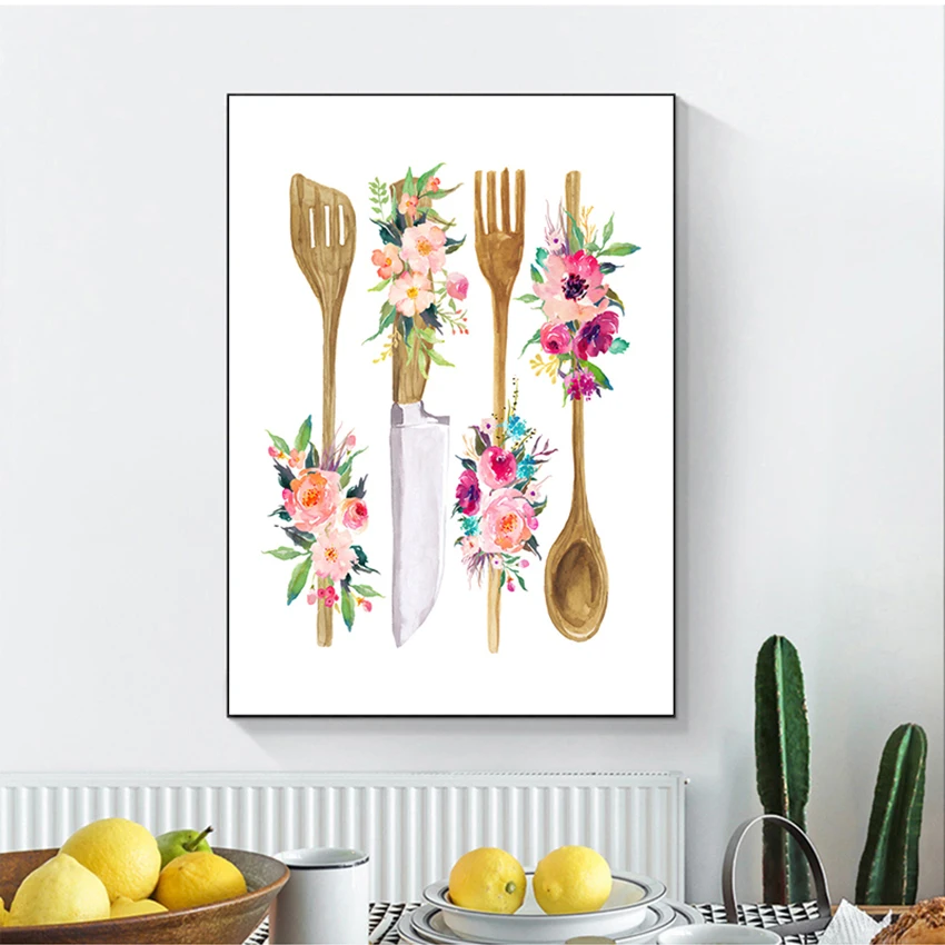 Картина на стену, плакат, украшение для дома, Цветочная кухонная утварь, печать на кухне, настенное искусство, Декор, деревянная утварь, холс...