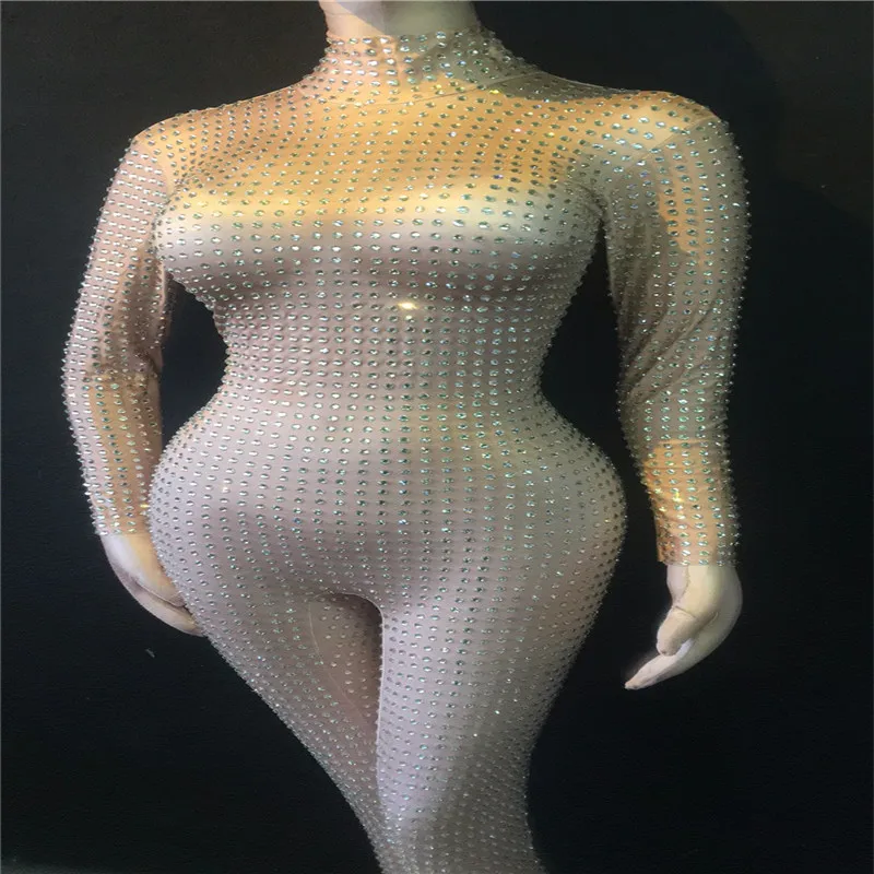 W40 Sexy female pole dance dress full diamonds stretch rhinestones jumpsuit drilling long sleeve leotard tights crystal siamese