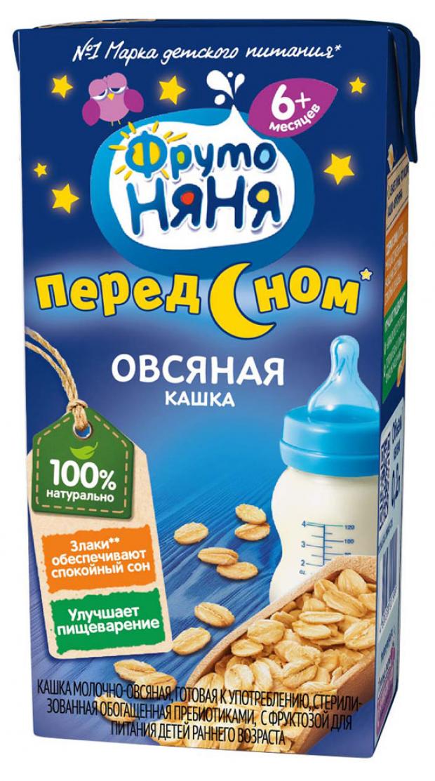 Детям с 6 месяцев Каша готовая молочная ФрутоНяня овсяная с 6 мес 200 мл. Ежедневное употребление жидких кашек нормализует стул и положительно влияет на функцию кишечника. Жидкие молочные кашки ФрутоНяня содержат злаки, которые обладают длительным эффектом насыщения, обеспечивая спокойной сон малыша. Овсяная молочная каша обволакивает слизистую оболочку желудка и нормализует двигательную активность кишечника. Овсяная крупа богата калием, фосфором, магнием, железом, фтором, цинком, йодом. Отличается высоким содержанием витамина Е и группы В. Польза овсяной каши заключается в большом количестве легкоусвояемых углеводов. Витамины группы В благотворно влияют на нервную систему, успокаивают и способствуют хорошему сну. Пребиотики, входящие в состав кашки, способствуют повышению иммунитета и улучшению состояния здоровья ребенка. Готова к употреблению.Улучшает пищеварение.Инулин укрепляет иммунитет.Без консервантов, красителей и ГМО. Рекомендации по употреблению: Перед употреблением необходимое количество кашки перелить из пакета в посуду для кормления. По желанию подогреть на водяной бане или в микроволновой печи (не ставьте пакет в микроволновую печь) до температуры кормления (36-37С) и хорошо перемешать. Можно кормить из бутылочки через соску, с ложки или из чашки. Кашку рекомендуется употреблять детям с 6 месяцев по 120-150 г в день, увеличивая к 12 месяцев до 200 г. Продукт готов к употреблению. Перед употреблением взбалтывать.