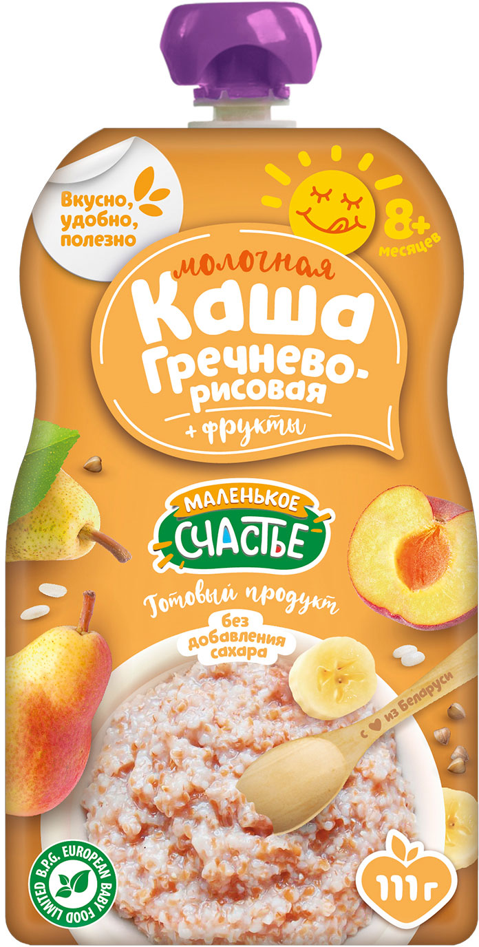 Срок годности в днях: 273Состав: Каша из смеси злаков (молоко коровье питьевое, мука овсяная, мука рисовая, мука пшеничная, мука гречневая, мука ржаная), пюре яблочное, сок грушевый, пюре персиковое, сок мультифруктовый (сок яблочный, сок мандариновый, сок ананасовый, пюре из персиков, пюре из киви, сок маракуйи), пюре банановое. / Каша гречнево-рисовая (молоко коровье питьевое, мука гречневая, мука рисовая), пюре яблочное, сок яблочный осветленный, пюре грушевое, пюре банановое, сок мультифруктовый (сок яблочный, сок мандариновый, сок ананасовый, пюре из персиков, пюре из киви, сок маракуйи).Пищевая ценность: Калорийность: 80Белки: 2Жиры: 1Углеводы: 16Страна изготовления: БеларусьПроизводитель: Маленькое Счастье