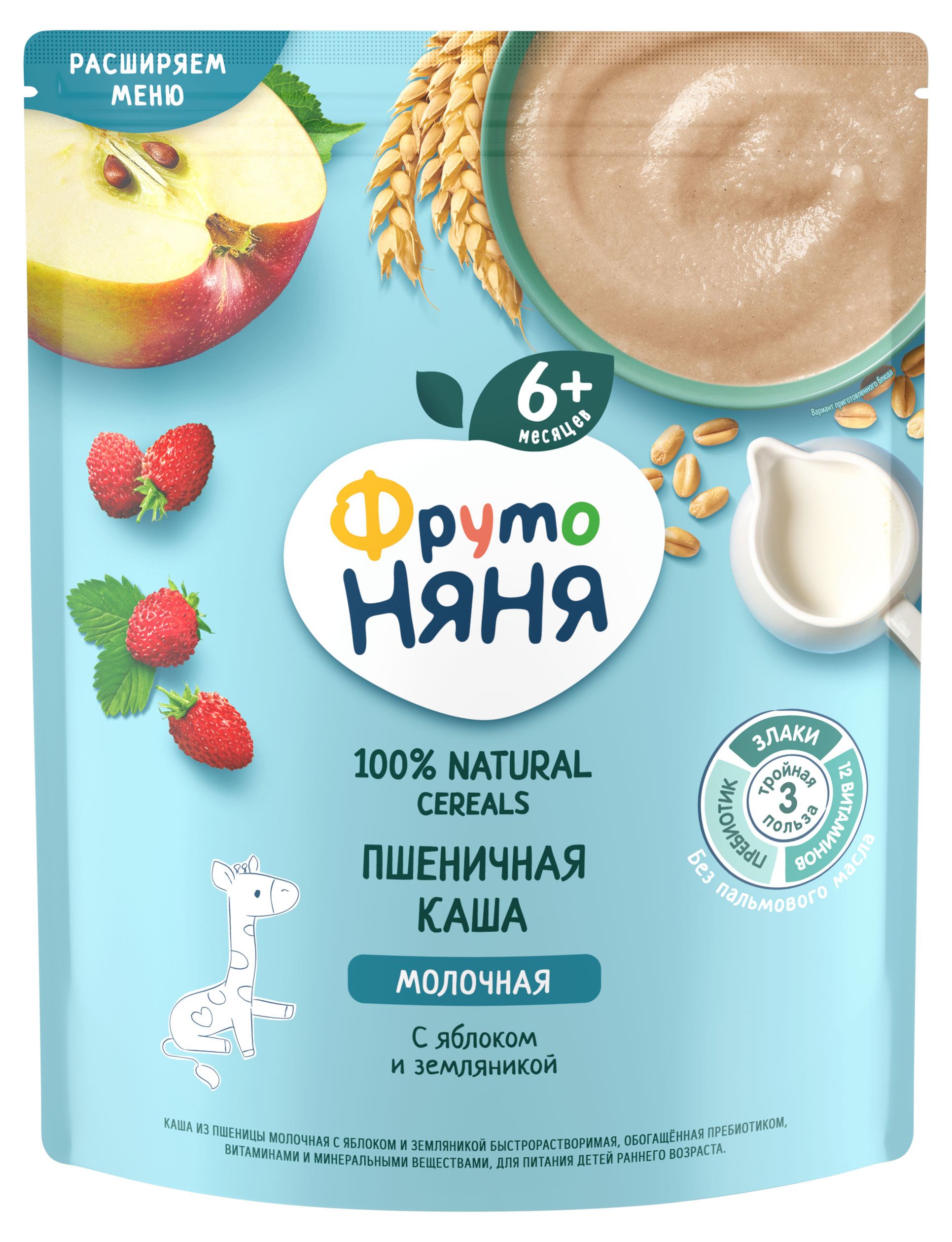 Сухая молочная пшеничная каша ФрутоНяня с яблоком и земляникой это яркое сочетание любимых фруктов и ягод, которое разнообразит рацион ребенка от 6 месяцев. Молочная каша ФрутоНяня пшеничная с яблоком и земляникой не содержит красителей, консервантов и ГМО. В составе только натуральные ингредиенты, а также целый комплекс питательных веществ и пребиотик инулин, способствующий комфортному пищеварению. Вкусная и полезная каша станет одним из любимых завтраков малыша, обеспечив его чувством сытости и энергией надолго.