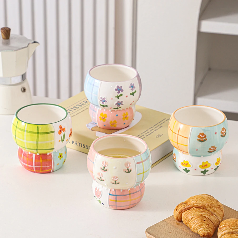 Керамическая кружка с цветными блоками и рельефным узором, подглазурная чашка для кофе, молока, милая посуда для напитков, кружка в пасторальном стиле, домашняя обеденная посуда