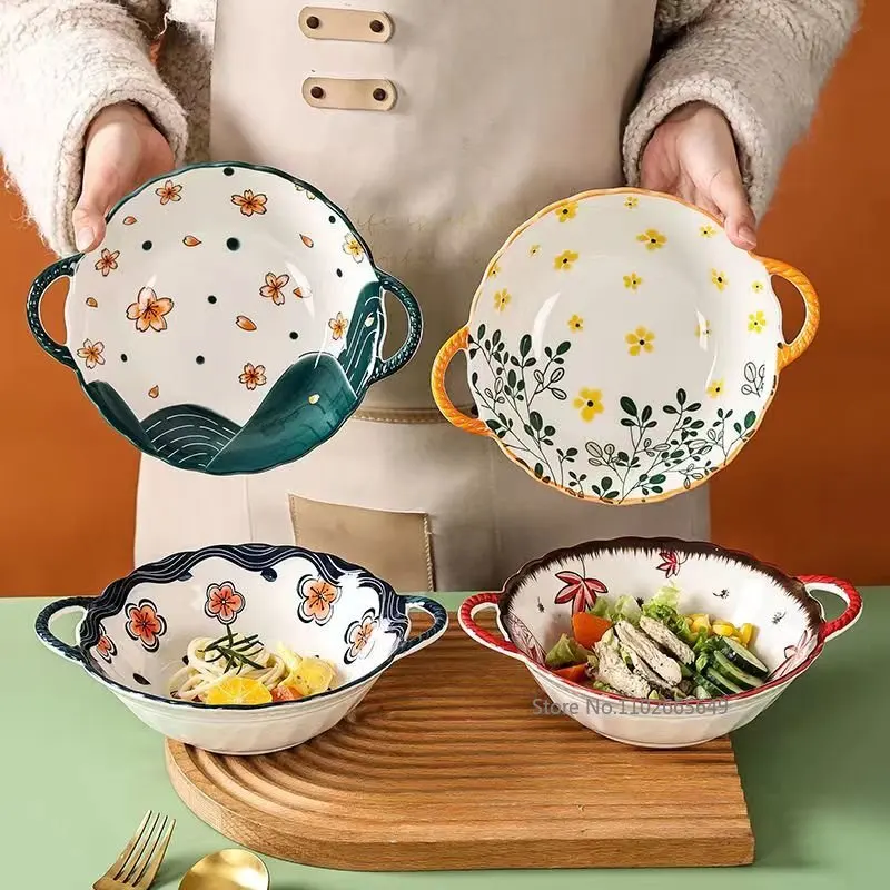 Керамическая миска для супа с ручкой, миска для салата и макаронных изделий, кухонная посуда, микроволновая печь, посуда, бытовая миска для лапши