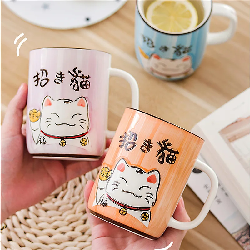 Керамическая чашка для воды с изображением кошки удачи, японская мультяшная Большая Кружка 400 мл, зеленая ручка, посуда для воды, ручная роспись, кухонная посуда для напитков, чашка для кофе и чая