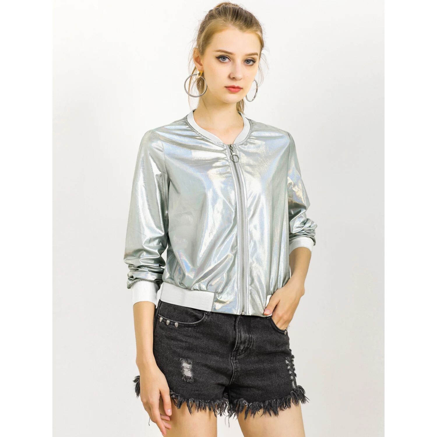 Женская повседневная укороченная куртка-бомбер с металлической молнией и воротником-стойкой ALLEGRA K, Серый, Женская повседневная укороченная куртка-бомбер с металлической молнией и воротником-стойкой ALLEGRA K