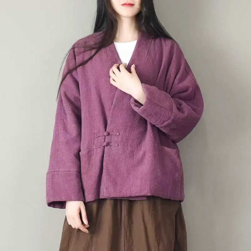 Китайская однотонная хлопковая верхняя одежда, осенне-зимняя свободная куртка с v-образным вырезом и лягушкой на пуговицах, женское теплое льняное пальто в стиле ретро, литературное