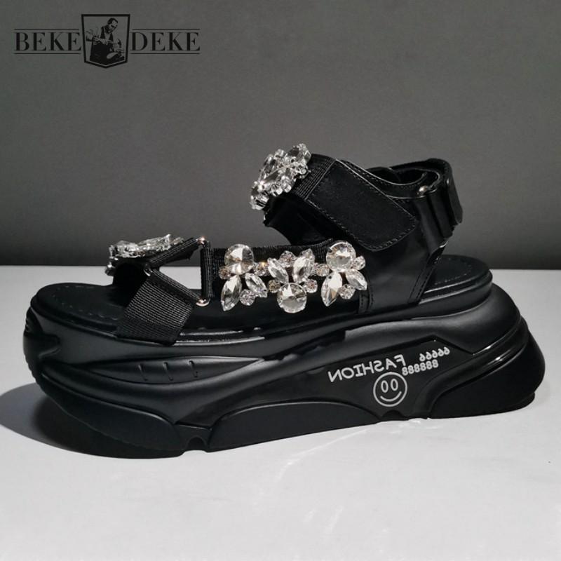 Sandals Summer Genuine Leather Thick Platform Sandal Women Hook Loop Crystal Open Toe Casual Sneakers Breathable Outside Female, Black