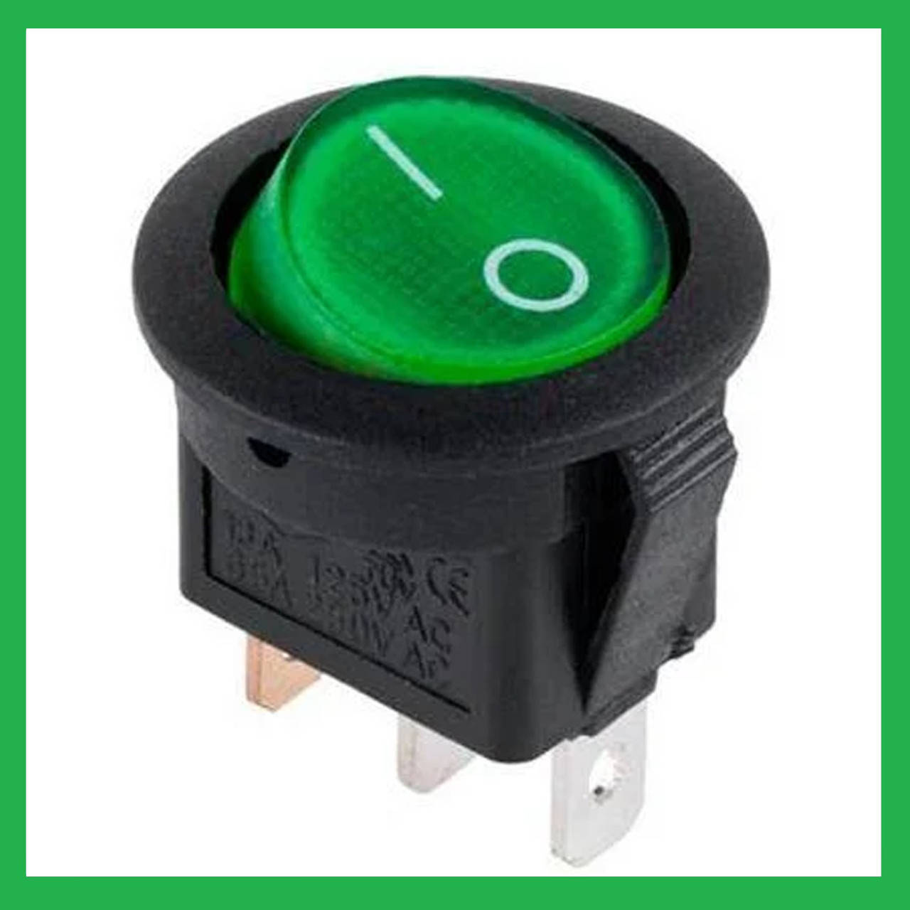 Двухпозиционный переключатель IRS 101-8C-220V ON-OFF Клавишный переключатель ON-OFF, 6А 250В, 3 контакта, посадка D=20.5мм (ЧЕРНЫЙ корпус, ЗЕЛЕНАЯ клавиша)
