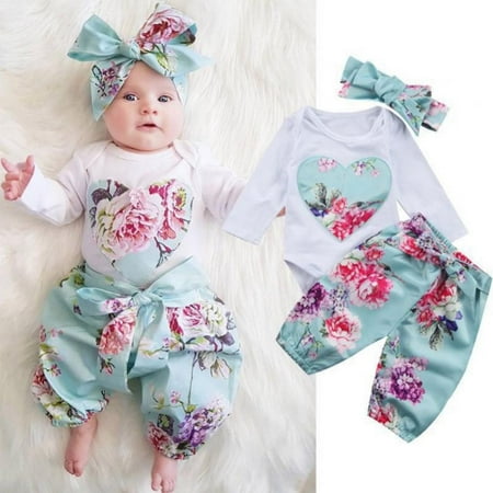 Xinhuaya Baby Girl Outfit Long Sleeve Ruffled Bodysuit Top Floral Pants with Headband 3Pcs Set 3-6 Months