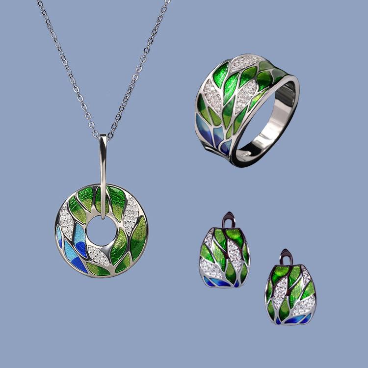 Классический комплект ювелирных изделий для женщин, ослепительные серьги с зелеными листьями бамбука, комплект колец, элегантные украшения, эмаль ручной работы