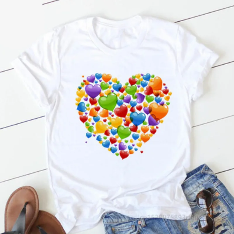 Women's Lovely Print T Shirt Summer New Heart-shaped Printed Round Neck Pullover Top 2020 All-match Casual Loose Leisure T Shirt