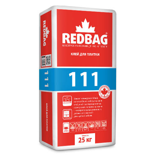 REDBAG 111 - клеевая смесь предназначенная для внутренней и наружной облицовки стен и полов из прочной бетонной, кирпичной, цементно-песчаной, цементно-известковой, гипсовой, и другой минеральной основы, которая не подвержена деформации керамической плиткой с водопоглощением от 1% и размером до 450×450 мм (или площадью не более 0,2 м2 с максимальной длиной одной из сторон не более 600 мм).