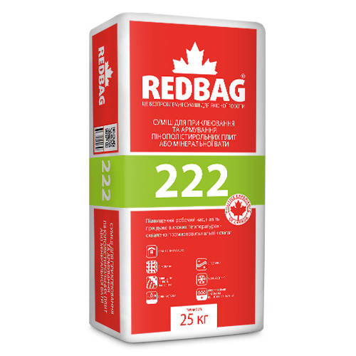 REDBAG 222 - смесь предназначена для приклеивания фасадных теплоизоляционных плит из минеральной ваты и пенополистирола укладки армированного гидрозащитного слоя.