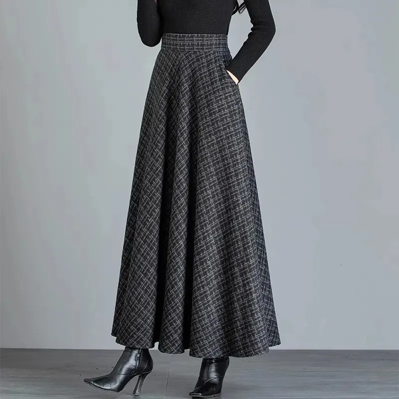 Клетчатая шерстяная универсальная зимняя длинная юбка Юбка с высокой талией Осень-зима Новая утолщенная юбка средней длины