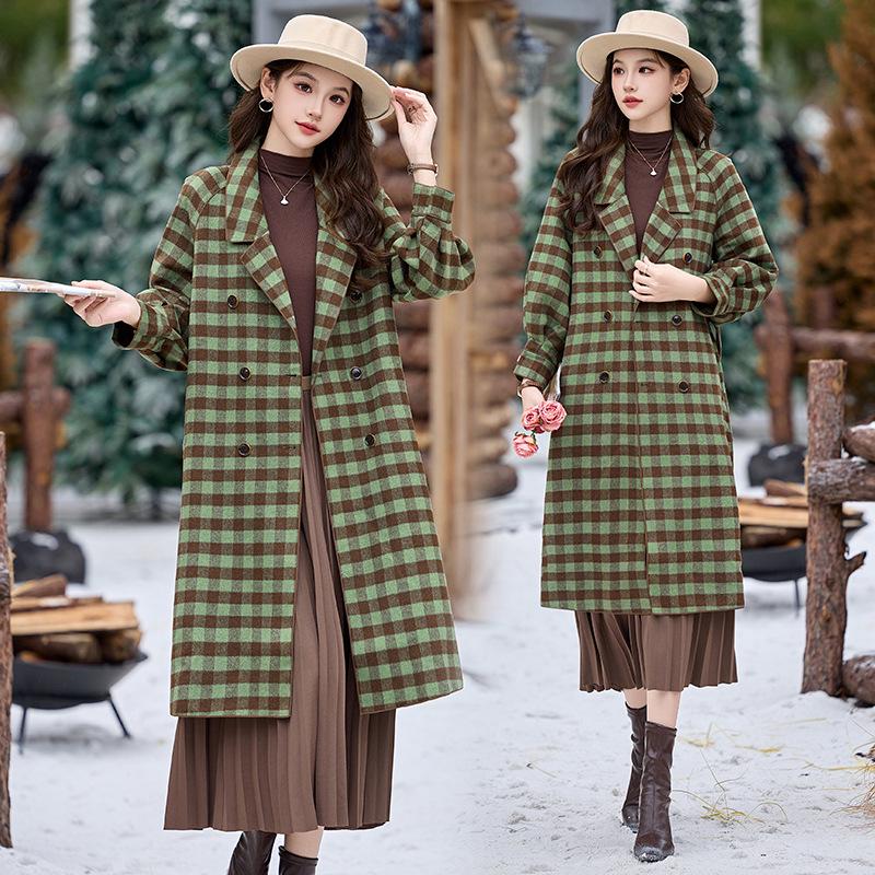 Клетчатое двустороннее шерстяное пальто с поясом на шнуровке и отложным воротником - Женское осенне-зимнее, HM2866 XXL 135-145 lbs зелёный