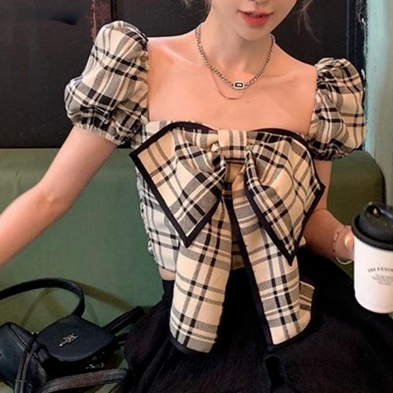 Клетчатые блузки для женщин Y2k, летние милые винтажные укороченные топы с бантом и пышными рукавами, тонкие модные корейские базовые клубные топы