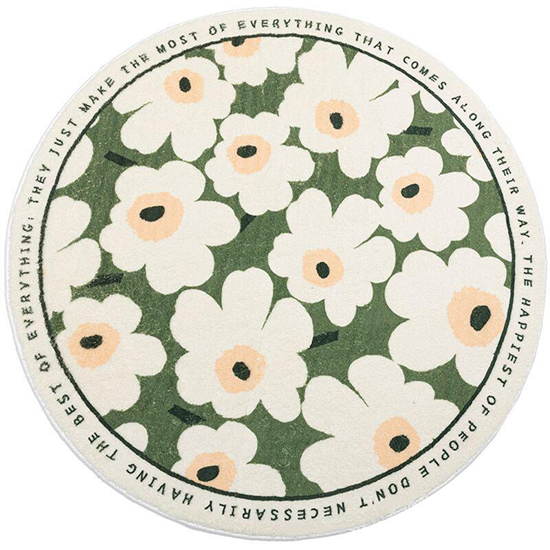 Ковер с рисунком в гостиной, прикроватная тумбочка в спальне, круглые коврики и большая площадь толстого ковра