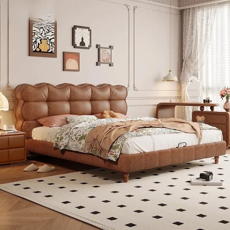 Кожаная большая кровать для главной спальни, антикварная спальня, французская кофейная кожаная мягкая сумка, двуспальная ретро-маленькая квартира, элитная свадьба