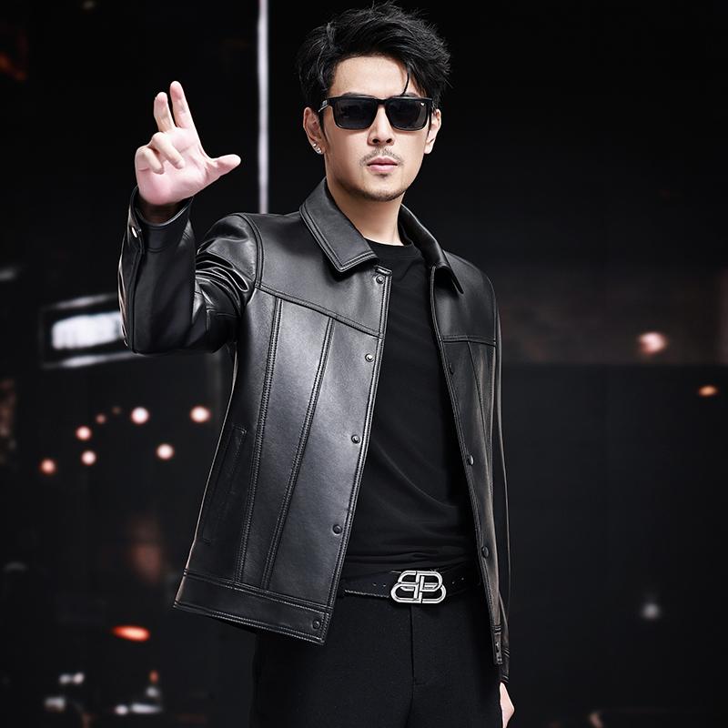 Кожаная куртка мужская короткая из овчины, облегающая, с пряжкой на лацкане, демисезонная кожаная куртка 5XL чёрный
