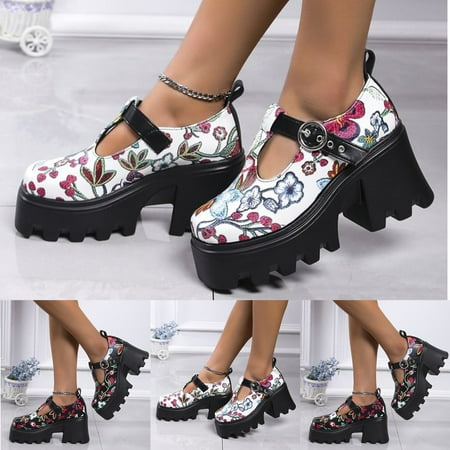 YTJX Women Not Positioned Flowers Sandals Thick Heel Thick Sole Retro Small Leather Shoes Flower Feature Non Positioning Printing Thick Heel Sandals