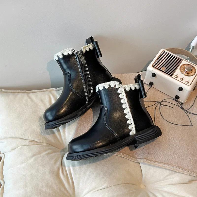 Кожаные ботинки для девочек с бантом сзади, детские ботинки принцессы, нескользящие, осень-зима 2024, новые детские короткие ботинки с боковой молнией 23 чёрный