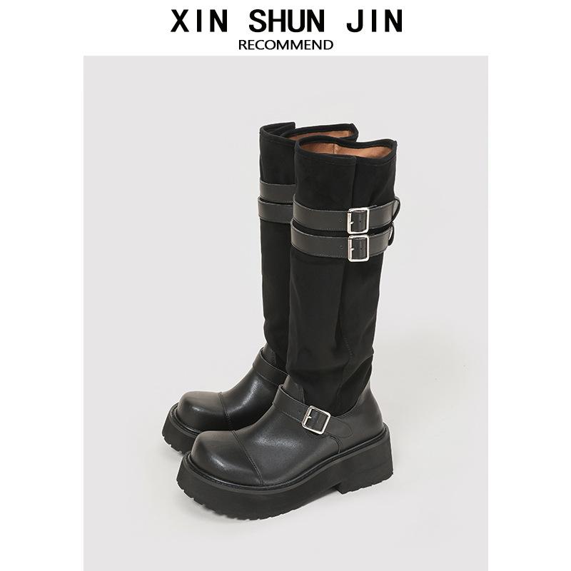 Кожа~ Ретро ботфорты на толстой подошве женские расширенная версия новые замшевые ретро ботинки с напуском рабочие ботинки 40 чёрный