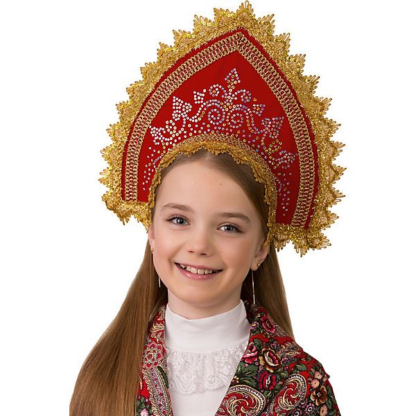 Кокошник для детского праздника дополнит образ. Украшен узором из пайеток и красивой тесьмой. Пластиковый корпус держит форму, сверху обтянут тканью.
