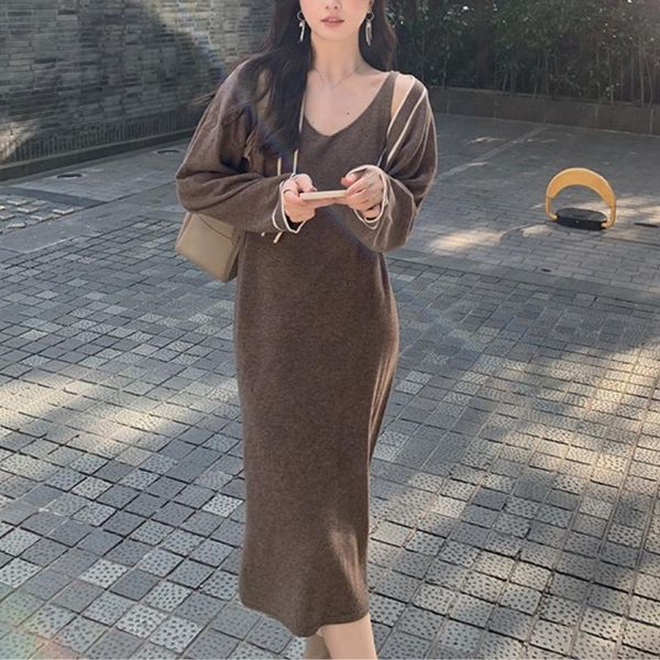 casual dresses 2 piece dress set women knitted suits elegant knit sweater vintage party office lady korean fashion cardigan 2021 autumn, Black;gray