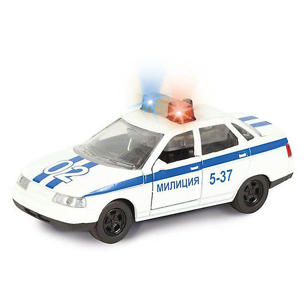 Машина Технопарк «Lada 2110 Полиция» – лицензионная копия прототипа. Капот, багажник и передние двери открываются, внутри детализированный салон. При нажатии на кнопку слышны звуки сирены и мигают сигнальные огни. Машина приходит в движение, если потянуть ее назад, поставив на пол.