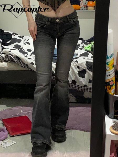 women's jeans rapcopter y2k celana flare celup dasi berpinggang rendah ketat wanita grunge basic jins ibu korea kasual streetwear 90s 2, Blue